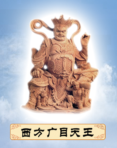 西方廣目天王的身上纏著一條龍,有時是一條蛇;蛇與龍都含有「變化」的意思。俗諺云:「神龍見首不見尾」,提醒我們,現實社會中,一切人、事、物均是瞬息萬變,無一常法,必須看得清楚,才能應付自如。