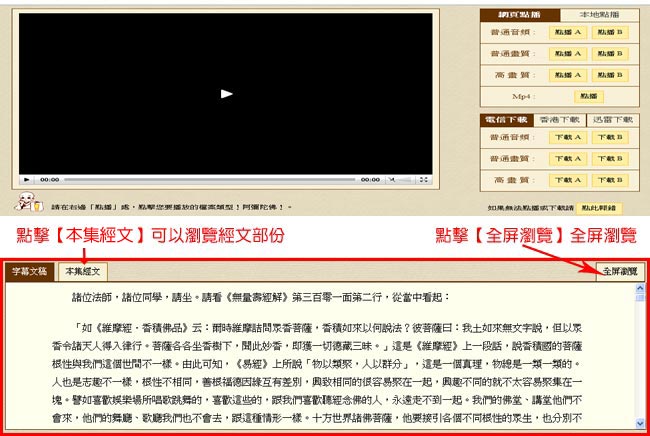 答:講演文字稿在視頻內容頁可以看到。您可以點擊「本集經文」只瀏覽本集的經文部分,也可以點擊「全屏瀏覽」讓文字放大到整個頁面,只瀏覽文字內容。